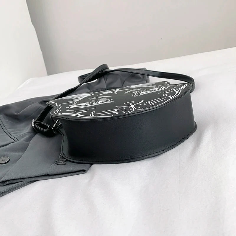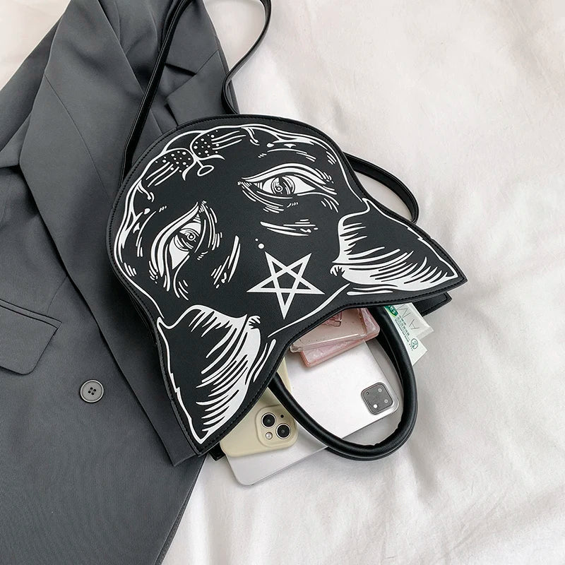 De Gothic Handbag - DarkMuse is een gedurfde tas die je mysterieuze en speelse kant naar voren brengt. Met een unieke 3D katgezicht ontwerp en een pentagram symbool, biedt deze tas de perfecte mix van schattige en griezelige esthetiek. Gemaakt van hoogwaardig PU-leer, is deze tas zowel luxueus als duurzaam. De ruime binnenkant biedt voldoende ruimte voor je telefoon, portemonnee, make-up en meer, terwijl de verstelbare schouderriem en stevige handvatten zorgen voor een veelzijdige draagstijl.